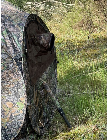 - Ouverture de passage trépied polyvalente : Permet la prise de vue au ras du sol et l'utilisation d'une lunette d'observation avec un oculaire à 45° pour la digiscopie. Cette ouverture est dotée d'une fermeture éclair à 4 curseurs : deux centraux pour le passage d'une jambe de trépied, un inférieur créant une fenêtre en T inversé à 15 cm du sol, et un supérieur pour une fenêtre en T idéale pour utiliser une lunette à 45° en position assise confortable.