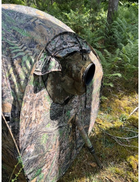 L'affût dispose de 4 points d'attache extérieurs à mi-hauteur dans chaque coin pour y fixer les 4 haubans et sardines fournis, ainsi que des sangles à la base des 4 coins pour un ancrage au sol avec 4 sardines supplémentaires incluses. Pour un camouflage additionnel, 12 cordelettes sont cousues à l'extérieur pour y fixer branches, feuillages ou roseaux.