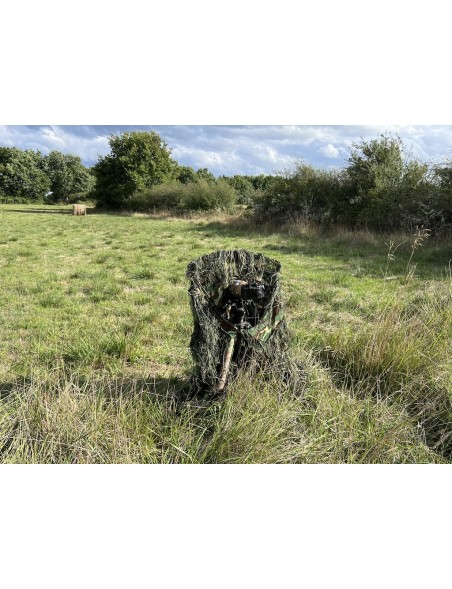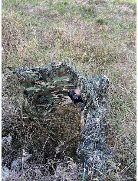 Atouts du Camouflage Ghillie : L'élément clé est le filet Ghillie de haute qualité. Avec ses brins texturés haute densité, il est parfait pour les prairies, friches et zones humides, assurant une fusion totale avec la végétation.